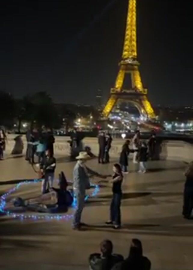At night, the brightly lit Eiffel Tower towers over a crowd of people on a raised platform. In the center, a man in a cowboy hat and a woman are dancing, surrounded by a circle of blue lights on the ground next to a sculpture. A musician plays nearby, while people watch, take photos, and stroll by. The city lights glow in the distance beneath the iconic landmark.