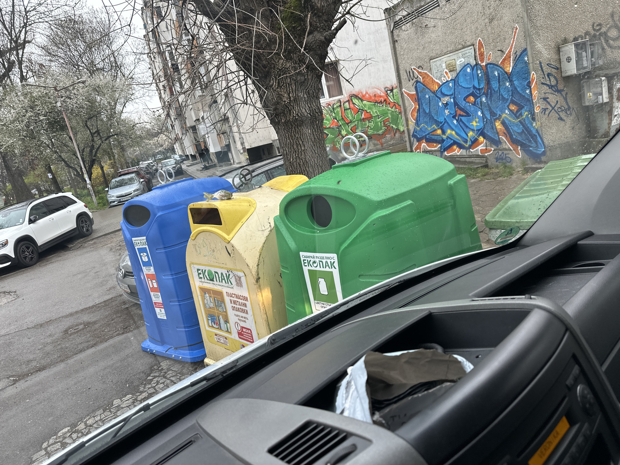street scene in Sofia, Bulgaria. Three recycling bins, blue, yellow, and green, are lined up on the side of the road. The bins are labeled "EKOPAK" in Bulgarian. A dead fish lays on top of the yellow bin. Behind the bins is a concrete wall covered in graffiti. In the background, there are buildings, trees, and parked cars. The photo is taken from inside a vehicle, with the dashboard visible in the foreground. The day appears overcast, with wet surfaces.