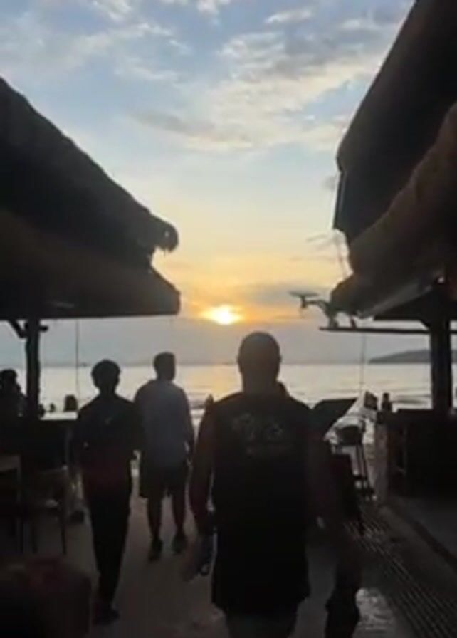 beach scene at sunset. The camera is positioned between two thatched-roof structures, likely part of a beachside establishment. Several people are walking towards the beach, silhouetted against the bright sun setting over the ocean. Some people are seated at tables, enjoying the view. Others are swimming or relaxing on the sand. A drone can be seen in the sky.