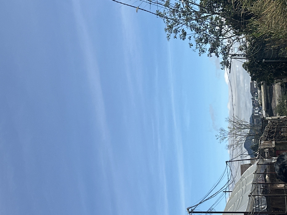 A sideways view displays a clear blue sky adorned with wispy, linear clouds. In the foreground, foliage and bare branches intermingle with utility lines. Distant buildings nestled against a hazy backdrop are visible on the right. A partial view of a structure with a white, curved surface is at the bottom of the image.