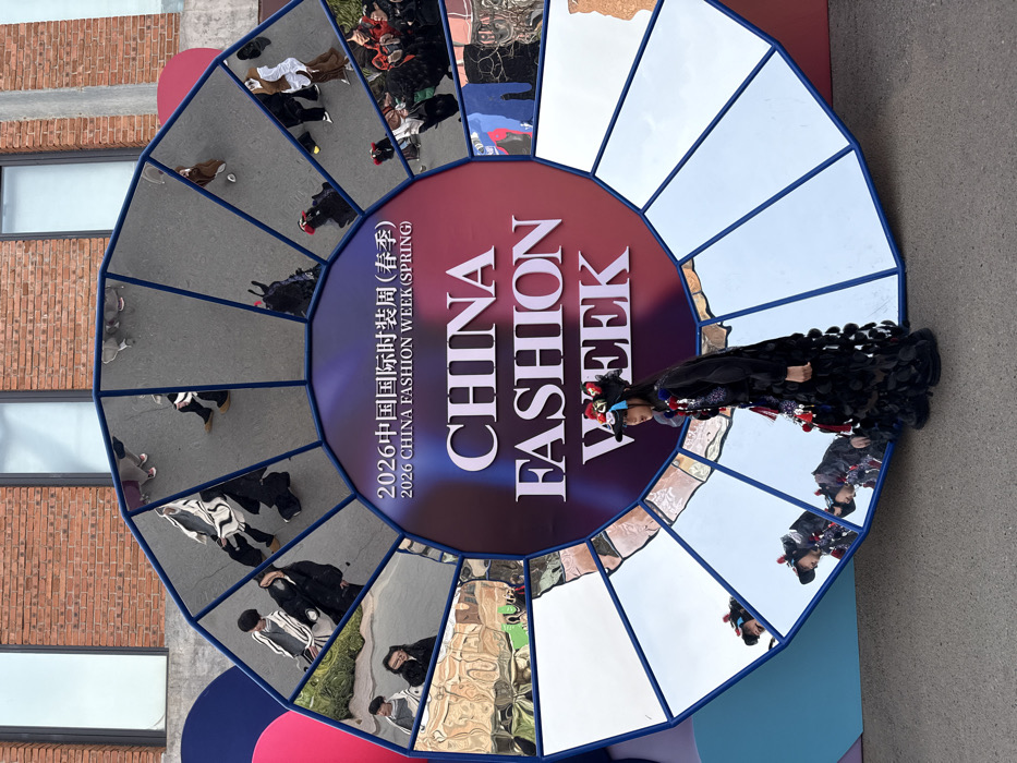 A vertical exterior shot depicts a female subject posing in front of a large, circular promotional display for "2026 CHINA FASHION WEEK (SPRING)" in Chaoyang District, China