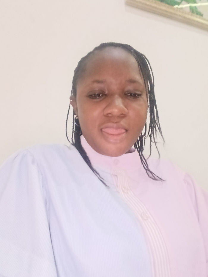 An adult female subject with dark skin and braided dark hair is depicted in a close-up, indoor setting