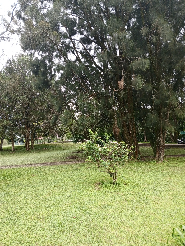 The image depicts a park or natural area within Khe Sanh Commune, Vietnam, under an overcast sky. The scene is dominated by a lush green lawn, closely mown, extending from the foreground to the mid-ground. A dirt or worn path, light brown in color, curves from the lower-left towards the mid-right. Numerous trees populate the area. On the right side, several tall trees with dark, textured trunks and dense, drooping, needle-like foliage (consistent with Casuarina or pine species) extend upwards and across the frame. Some branches exhibit dried material or detritus hanging. To the left, a cluster of smaller, broader-leafed trees with lighter bark and dense green canopies are present. In the mid-ground, slightly right of center, a standalone shrub with green leaves and multiple white blossoms stands prominently. In the background, visible through the trees on the left, a small structure, possibly a gazebo or pavilion with a reddish roof, is partially discernible. On the far right, behind the large trees, a paved surface or road is visible, where a dark scooter or motorcycle is parked. A green sign or structure is also faintly visible near the scooter. No individuals are present, and no active interactions are occurring.