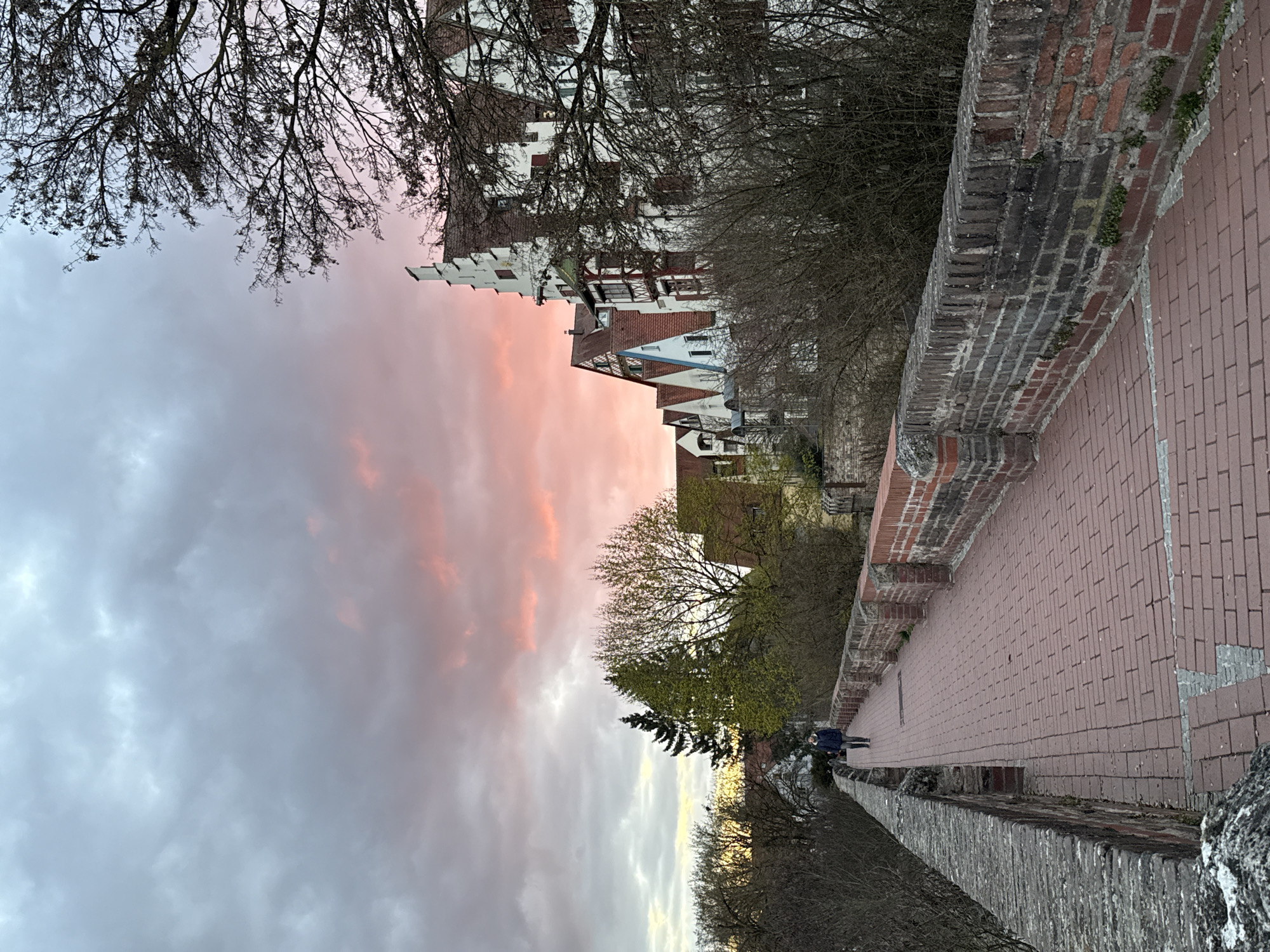 The image depicts a pedestrian walkway in the city of Ulm, Germany, specifically a section along the historic city wall or "Mauerweg," likely near the Fischerviertel, at dusk. The upper portion of the frame shows an overcast sky, with a transition from pale gray-blue at the top to vibrant pink and orange hues near the horizon on the right, indicating a sunset. A long, straight pedestrian path, paved with reddish-brown rectangular bricks, extends from the foreground into the mid-ground on the left. The path is bordered by two distinct walls. The left wall is a weathered, grey stone structure, appearing robust and ancient. The right wall is constructed of red bricks, interspersed with sections of darker, older bricks, exhibiting minor vegetation growth at its base. One individual is visible on the brick path in the mid-ground, walking away from the viewer. The person wears a dark blue jacket, dark trousers, and light headwear, their posture consistent with a casual walk. To the right of the path, beyond the brick wall and a dense line of mostly bare deciduous trees and shrubs, stands a row of multi-story historic buildings. These structures feature white facades, steep gabled roofs (some with stepped gables), dark brown half-timbering, and reddish-brown window shutters. Further into the background on the left, several trees with budding green foliage are visible, alongside a prominent dark green coniferous tree. The overall lighting is soft, characterized by the low light of evening and the warm colors of the sunset reflecting off the clouds.