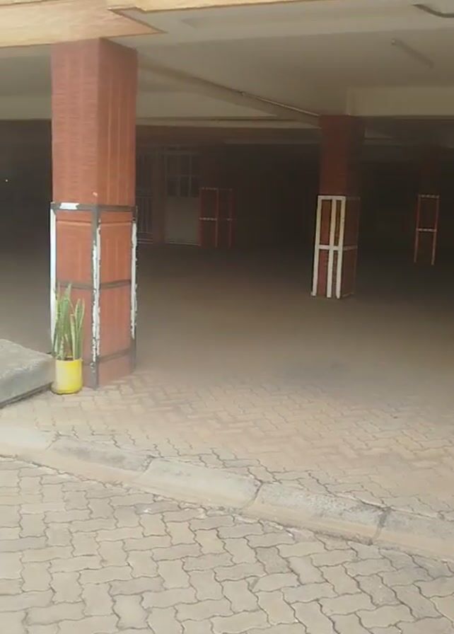 parking garage under a building. A white SUV is parked in one of the spaces. There are potted plants near the supporting columns. The ground is paved with interlocking bricks. The camera pans up to show the building with white-framed windows and a closed black gate. The sky is overcast.