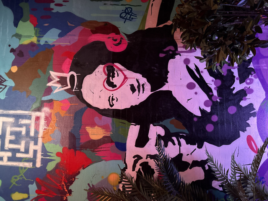 A wall mural in Varna, Bulgaria, depicts a stylized, pop-art rendition of the Mona Lisa. The central figure is rendered in black and a muted pink/purple, featuring a white crown on her head, a prominent pink heart shape obscuring her left eye, and pink headphones over her ears. To the left of the Mona Lisa, a partially obscured, black and white stencil-style figure appears to hold a rifle, with another less distinct figure positioned beneath it. The background of the mural is an abstract composition of various spray-painted colors, including blues, greens, reds, oranges, pinks, browns, and purples, characterized by visible drips and a white labyrinth pattern in the upper-left quadrant. Artificial green foliage, consisting of a palm-like plant on the left and a bush with dark leaves on the right, partially covers the lower sections of the artwork. The scene is illuminated by ambient light, casting a distinct purple hue on the lower portions of the mural and the plants.