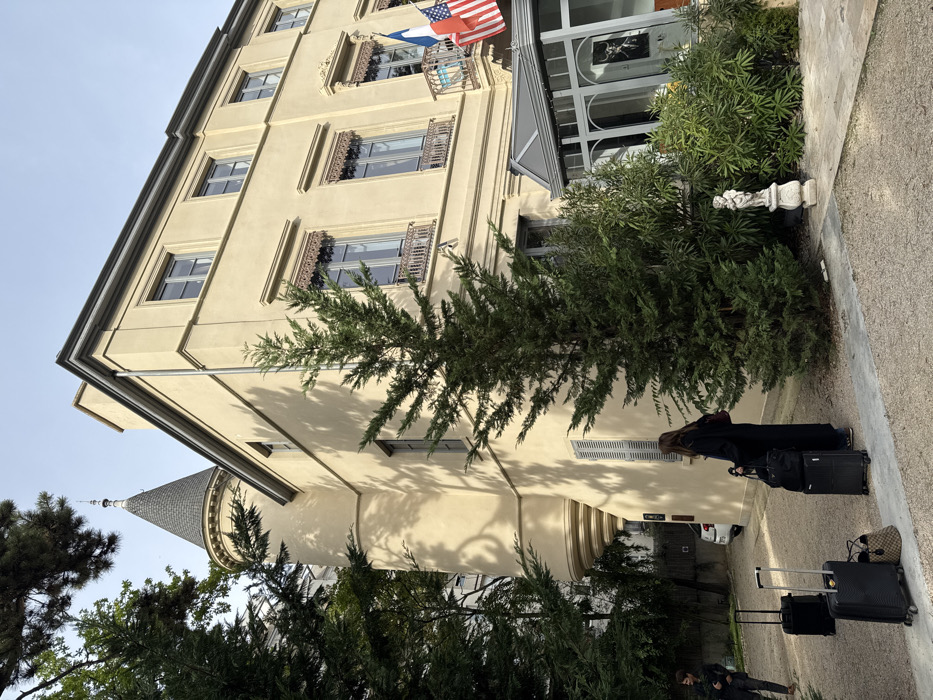 An exterior daytime image captures a multi-story building with a light-colored, possibly cream, facade, featuring a prominent corner turret topped with a dark conical roof and finial. The building is located in Villeurbanne, France. Multiple windows with light frames are visible; some second-story windows feature ornate iron grilles and decorative valances. A balcony on the upper right displays a French tricolor flag and an American flag. An attached glass conservatory or enclosed porch structure is visible on the right side of the building. The foreground and midground consist of a gravel-paved area with concrete edging. One female individual stands in the midground, seen from behind, wearing a long dark coat. She is positioned to the left of a tall, conical conifer and holds the handle of a black rolling suitcase, which has a smaller black bag resting on its top. Two additional black rolling suitcases and one patterned tote bag are situated on the gravel near her. In the background on the left, a male individual is partially visible, standing near a white parked car. Numerous evergreen trees and shrubs are present throughout the scene. A white classical-style statue of a cherub or child figure on a pedestal is situated among the bushes near the conservatory. Shadows from trees are cast upon the building's facade.
