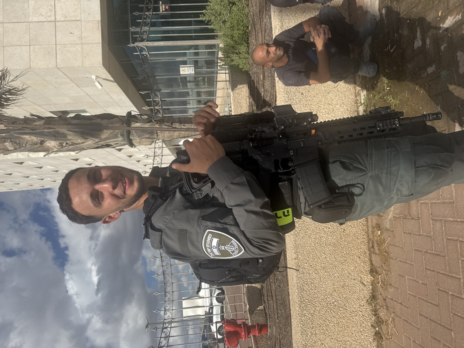 An outdoor scene in Lod, Israel, depicts two males near the Lod District Court building under a partly cloudy sky. In the foreground, a young adult male, smiling at the camera, stands equipped in an Israel Police tactical uniform consisting of a grey long-sleeved shirt, matching cargo pants, a black tactical vest displaying an Israel Police emblem patch on the left sleeve, and a black backpack. He carries a black assault rifle with a magazine and optics, held vertically. A neon yellow band is visible around his waist. To his right, slightly behind and lower, a bald adult male in a dark t-shirt and pants squats on the paved ground, looking towards the left with a slight smile. The background features the distinctive light-colored, multi-story facade of the Lod District Court building, fronted by a dark metal fence and a security camera. A prominent palm tree trunk stands between the primary subject and the building. To the far left, a red fire hydrant and white parked vehicles are visible behind a separate metal fence. The immediate ground is paved with red interlocking bricks.
