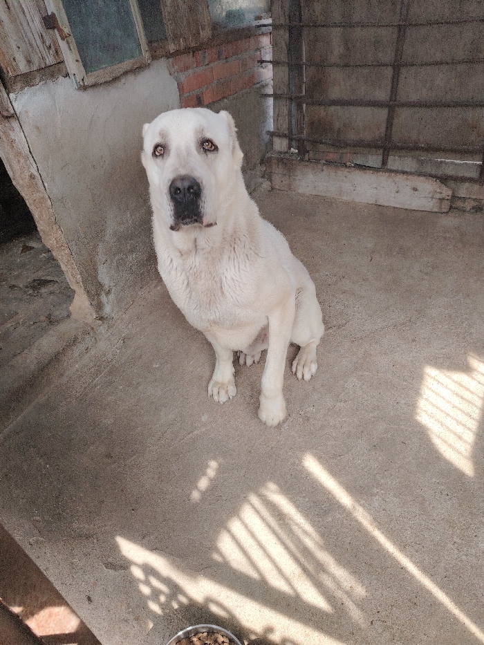 - "A large, white or cream-colored Central Asian Shepherd Dog is observed sitting upright on a concrete surface in Dryanovo, Bulgaria" by FM-X84Fh1, licensed under CC BY 4.0