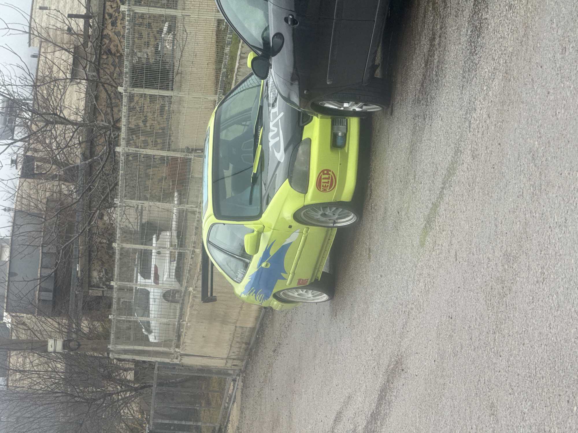The scene depicts a street in Mas'ade, Israel, under overcast conditions. The foreground consists of a dark gray, damp paved surface. Two vehicles are parked closely together. On the left is a highly customized, two-door, lime green vehicle, resembling a Honda Civic. It features a black hood with white stylized lettering, blue lightning bolt graphics extending from the side into the rear quarter panel, a black rear spoiler, a sunroof, and silver multi-spoke aftermarket wheels. A red "HELLA" sticker is visible on the front bumper. To its immediate right, the front passenger side of a black compact vehicle, possibly a hatchback, is parked, showing a silver-spoked wheel. In the midground, a gray metal mesh fence with white support posts runs along the top of a concrete retaining wall. Behind this fence, a white SUV is partially visible. The background includes leafless trees and several buildings with light-colored stone facades. A utility pole with a small white component is present on the far left. No people are visible.