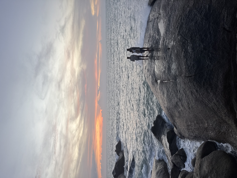 A serene, sideways view of the ocean meeting the shore. Three silhouetted people stand on a large, dark rock formation at the water's edge. Gentle waves break against the rocks, creating white foam. The sky displays a colorful sunset, transitioning from gray clouds to vibrant oranges and yellows. The sea stretches towards the horizon, reflecting the light.