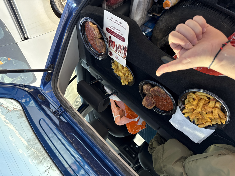 An open blue car trunk reveals a makeshift dining setup on its folded rear seats, parked outdoors in Kazichene, Bulgaria, near ul