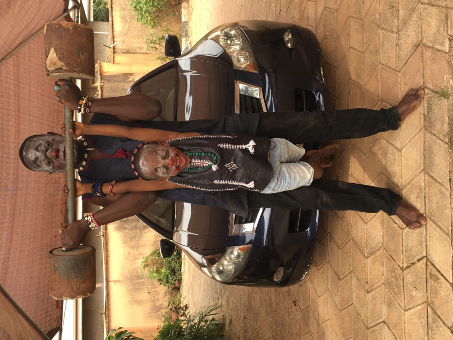 An adult male and a young child are centered in an outdoor scene on a paved surface in Sabon Tasha, Nigeria. Both individuals have dark complexions and wear white facial makeup with black markings and red accents (a red clown nose on the man, a red painted mouth on the child). The man, standing barefoot, wears a dark sleeveless tunic with a red tassel, black trousers, multiple beaded bracelets, and two shell necklaces. He holds a crude barbell, constructed from a metal bar with large, cylindrical wooden weights, aloft with both hands above his head. The child, also barefoot and wearing a dark grey sleeveless top with white embroidery, light blue denim shorts, a red and white beaded headband, and a green beaded necklace, hangs suspended from the center of the barbell, held by the man's grip. The child's mouth is open, suggesting a laugh or shout. Directly behind them is a dark blue Honda Accord sedan facing the viewer, with visible scuffing on its front bumper. The ground is paved with reddish-brown interlocking tiles arranged in a diamond pattern. A light brown plastered wall is visible in the background, with green foliage to the left and right. A light-colored fabric canopy is partially visible overhead.
