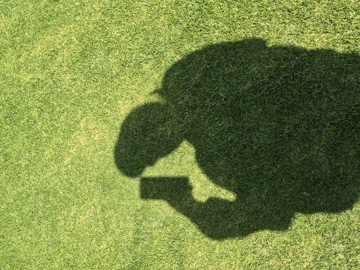 The image showcases a shadow cast on a vibrant green lawn. The shadow suggests a person holding a rectangular object, possibly a phone or small tablet. The lawn is tightly cropped, with blades of grass clearly visible. The shadow covers a significant portion of the frame. The rest of the grass is illuminated by daylight, displaying a textured surface.