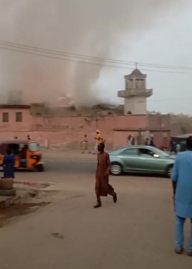 building engulfed in smoke and flames, with several people in the vicinity. A plume of thick, grey smoke rises from behind a peach-colored building. A square tower-like structure stands nearby. In the foreground, a man in a brown robe walks across the street. A light-green car drives past, and a three-wheeled vehicle, locally known as a "keke," is also visible. Other people can be seen walking or standing around, with one individual wearing a yellow shirt. The road appears dusty, and there are utility poles and wires overhead. The overall atmosphere suggests a chaotic and urgent situation due to the fire.