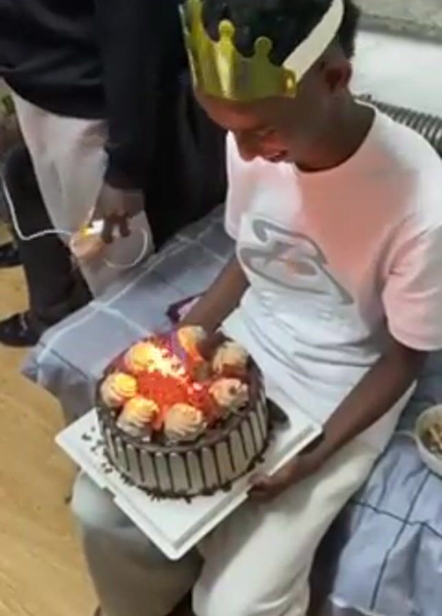 A young Black male, wearing a white shirt, light-colored sweatpants, and a gold paper crown, sits cross-legged on a bed covered with a gray and blue patterned blanket, holding a chocolate birthday cake with lit candles and red accents. The cake is on a square white cake board. He is smiling, and there are other people standing around him, one of whom is reaching out to the cake. The floor is wooden, and the setting appears to be indoors, with a window visible in the background.