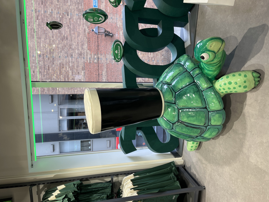 large, green, turtle statue, which is being used as a table in a store in Dublin, Ireland (latitude: 53.344, longitude: -6.262). The turtle is positioned in front of a large window, behind which there is a brick building with a street scene. The turtle is topped with a large, black, pint glass, which has a white rim. The turtle's head and one leg are visible. The store has a grey floor and a black metal rack with green jerseys. The store's wall is white. In the window, there are large, green, styrofoam letters that spell out "ARDA." There is also a green and white sign with the word "IRELAND" on it. There are two small, green and white signs with logos that resemble rugby balls. The logos on the signs read "GLAS" and "ANGLES" in white lettering. The scene appears to be in a sports store.