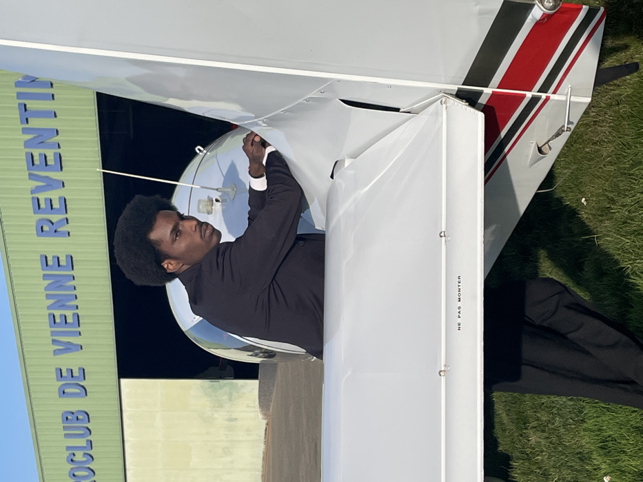 An outdoor scene depicts a Black male subject leaning against a white light aircraft in front of a hangar at the Vienne-Reventin Airport (LFHV) in Chonas-l'Amballan, France