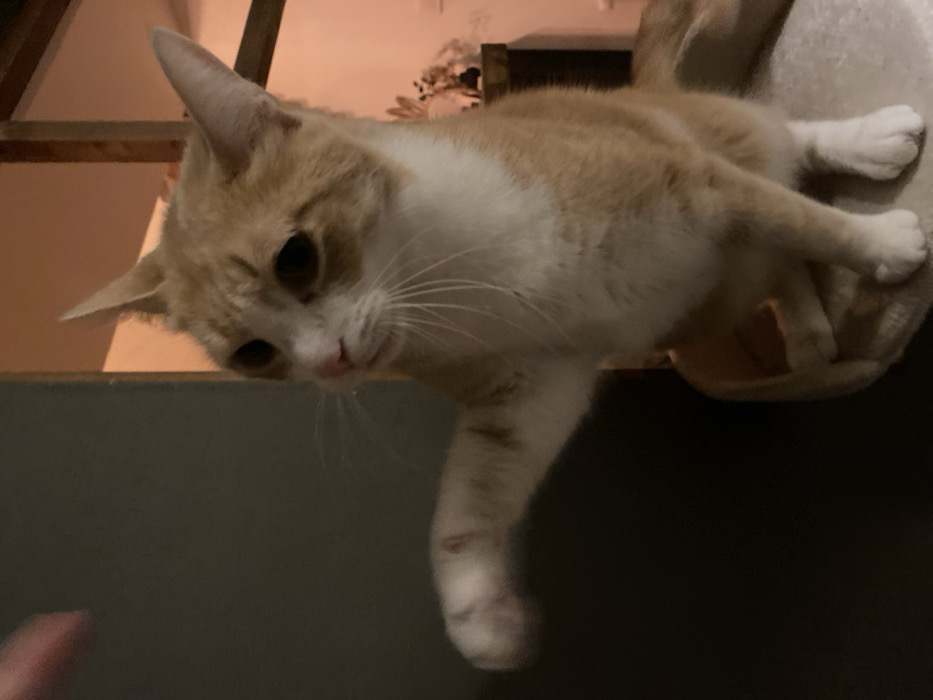 An orange and white cat is perched on a cat tree, peering downwards. The cat has a white chest and belly, with orange patches on its head and back. The cat’s front paw is dangling over the edge. The background is blurred, showing a wall and wooden structures. A hand is barely visible in the bottom left corner, perhaps reaching towards the cat. The cat has a curious expression.