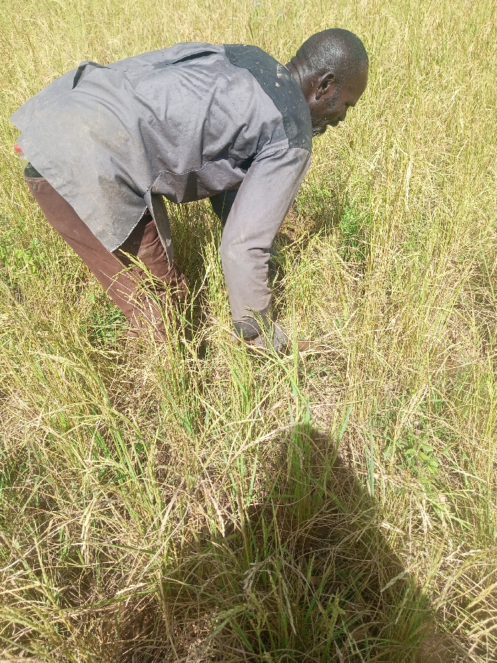 An adult male, identified as being in Sabon Tasha, Nigeria, is depicted outdoors, bent forward at the waist. He wears a dark grey, long-sleeved garment, appearing dirty or worn, over brown trousers and dark footwear. His hands are positioned low towards the ground, obscured by the vegetation and his posture. The individual's head is tilted downward, his gaze directed at the immediate ground cover. The environment consists of dense, mixed green and dry yellowish-brown vegetation, characteristic of a field, possibly a crop such as rice, with visible seed heads. Sunlight illuminates the scene from behind the camera, casting a distinct shadow, likely of the photographer, onto the vegetation in the lower right foreground.