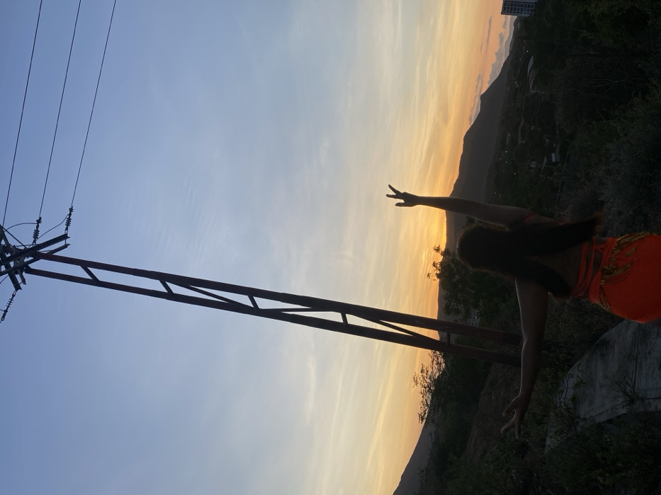 A rotated view shows a woman in an orange outfit silhouetted against a sunset. Her arms are outstretched. In the foreground, a utility pole with lines stretches across the sky. Mountains are visible on the horizon, with some buildings. The overall image has a slightly hazy, warm tone.