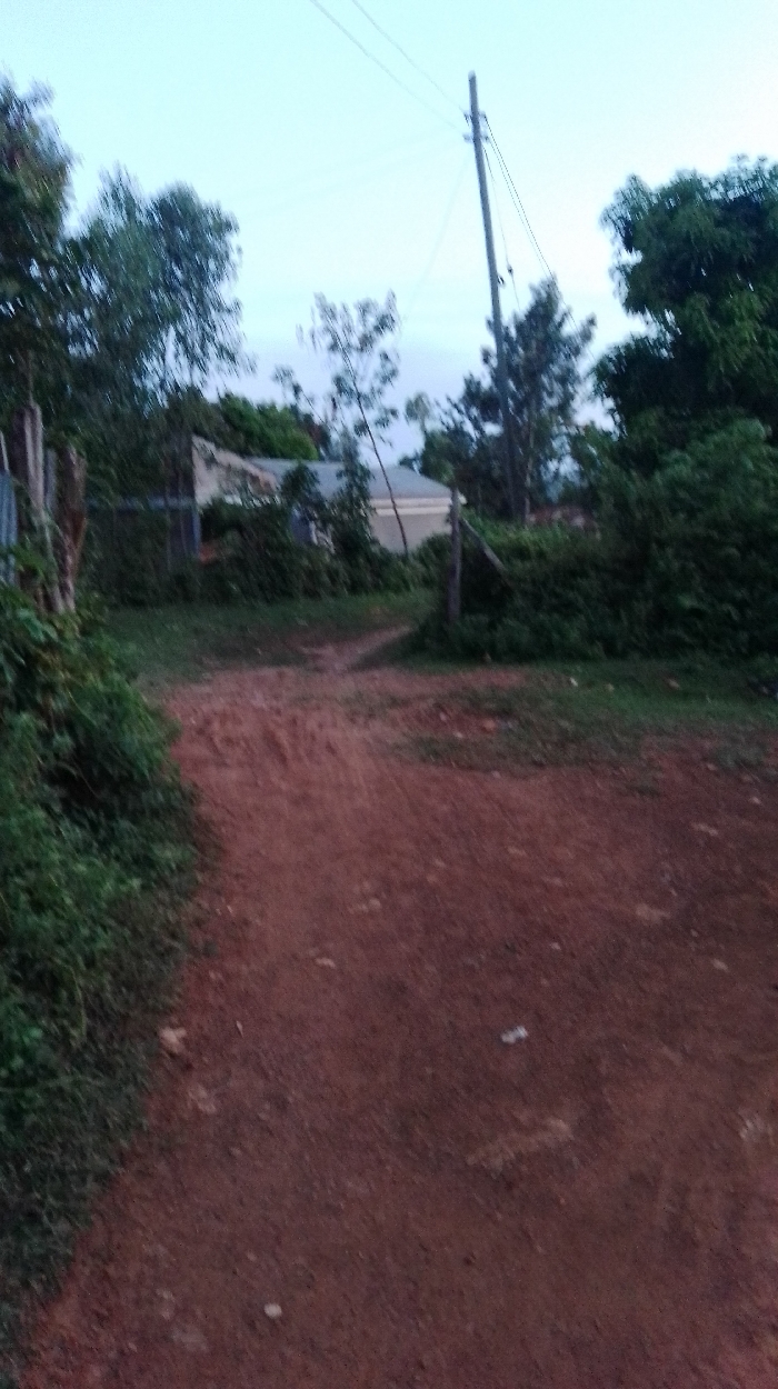 The scene depicts an outdoor environment in Siaya Township ward, Kenya. A red-brown dirt path, uneven and potentially worn by traffic, extends from the foreground into the midground, subtly curving towards the center-left. Dense green vegetation, consisting of grass, shrubs, and trees, borders the path on both sides, with a more significant accumulation on the immediate left. In the midground, partially obscured by foliage, a light-colored, possibly beige or cream, single-story building with a darker roof is visible. To the right, a wooden utility pole stands vertically, supporting multiple overhead power lines that stretch across the upper portion of the frame. Various trees with green canopies are dispersed throughout the background, contrasting with the light blue-grey sky above. No individuals, explicit actions, or direct interactions are observable within the frame. The lighting is diffused, suggesting either twilight conditions or an overcast day.