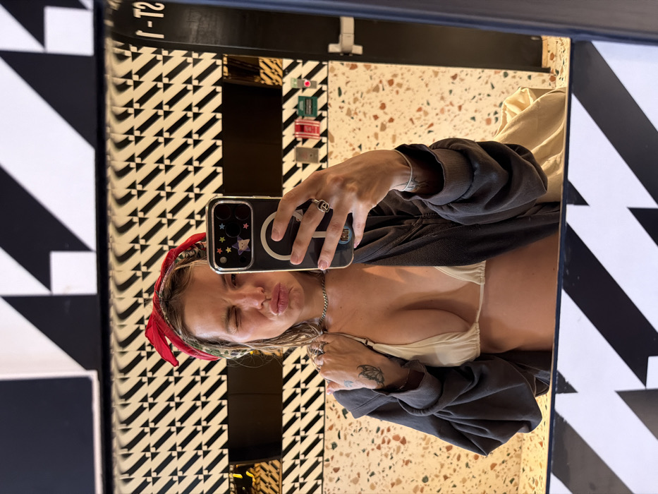 A mirror selfie captures a woman wearing a beige bikini top and a gray hoodie