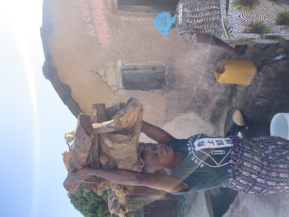 A woman struggles to lift a bundle of firewood on her shoulders, secured with thin ropes. She wears a green t-shirt with writing and a patterned skirt. Behind her is a weathered building with a small window. To her right, another woman in a patterned top and blue head wrap stands near a yellow container and a white bucket. The scene seems to be an everyday occurrence, perhaps in a rural setting.