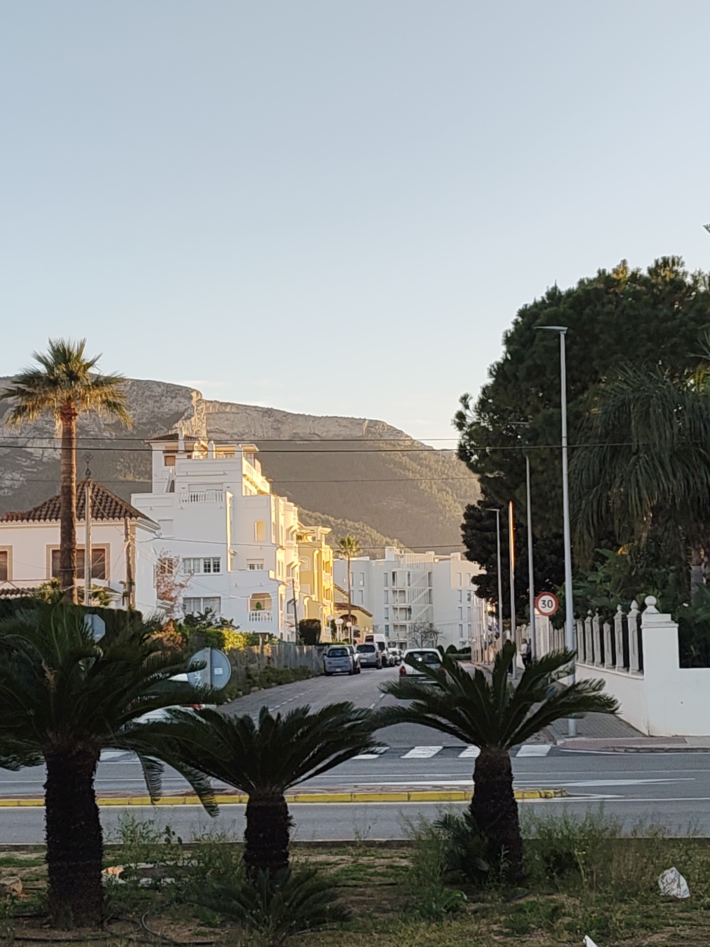This image captures a street scene in Dénia, Spain, during what appears to be late afternoon or early morning, characterized by warm, direct sunlight on buildings and a clear, pale blue sky. In the foreground, a narrow, unkempt median strip contains three cycad (Sago palm) trees of varying heights, with sparse ground vegetation. A discarded white plastic bag is visible on the right within this strip. The midground features a paved, two-lane road with a yellow median stripe and white dashed lines. A pedestrian crossing with white zebra stripes is visible on the right side. Several vehicles, including a white sedan and a blue car, are present further down the street, either parked or in motion. To the left of the road, a tall palm tree stands next to a multi-story white building with a terracotta-tiled roof. Beyond this, a series of modern, multi-tiered white residential buildings with balconies are brightly illuminated by the sun, appearing to ascend a gentle slope. These structures are set against the backdrop of a prominent, rugged mountain range, likely Montgó, which dominates the horizon under a clear sky. To the right of the road, a white decorative fence or wall parallels the street, separating it from dense green foliage, primarily large trees. Multiple modern streetlights are positioned along this side. A circular red and white "30" speed limit sign is affixed to one of the poles. A lone human figure is faintly visible on the sidewalk in the distance, partially obscured by foliage and the fence. Additional white buildings are discernible in the far background, blending into the lower mountain slopes.