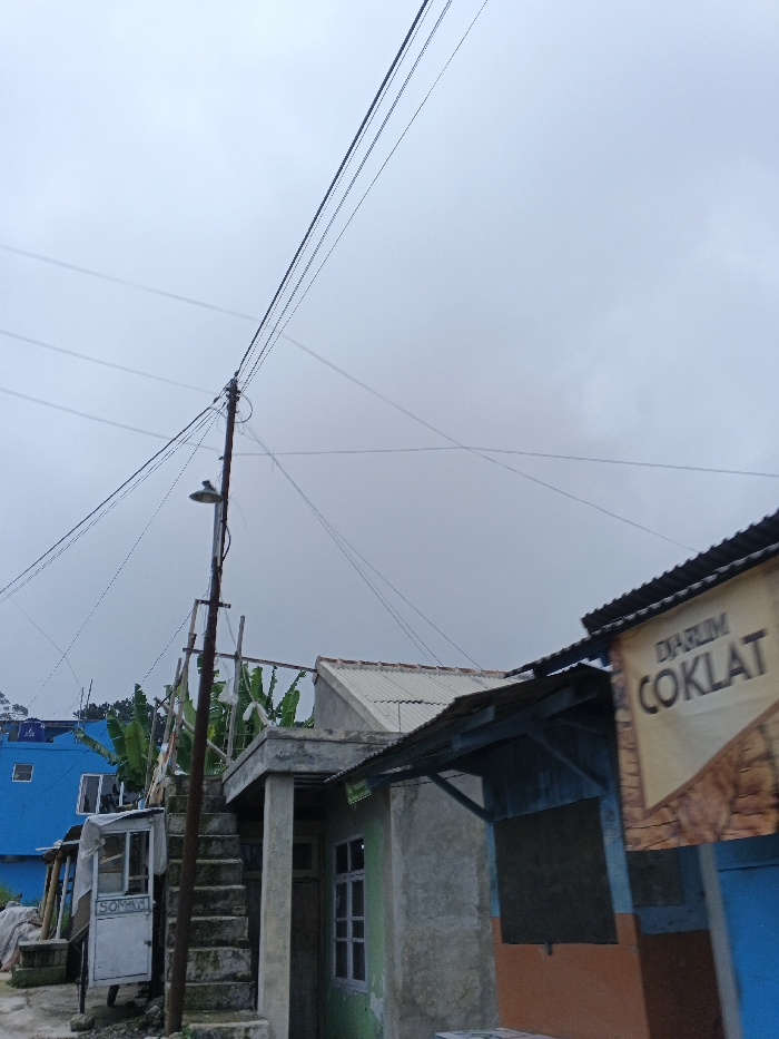 This image depicts a street scene in Kampong Chhnang, Cambodia, under an overcast sky. A tall, dark utility pole stands centrally on the left, featuring a single street light fixture and numerous electrical and guy wires extending in multiple directions across the upper half of the frame. To the left of the pole, a white mobile vendor cart with a glass display section is visible, bearing the text "SOMAI." Immediately behind the pole and cart, a set of unpainted concrete stairs ascends towards the right, leading to the upper level of a multi-story, light grey building. Green banana plants are visible behind the stairs and the building. To the right, a building or storefront with a corrugated metal roof is present, featuring a prominent rectangular banner that reads "DJARUM COKLAT" in large brown letters on an orange background. This building exhibits sections painted blue and brown. Further in the background on the left, a distinct bright blue building with a lighter blue roof section is partially visible. No individuals or vehicles are present in the scene.