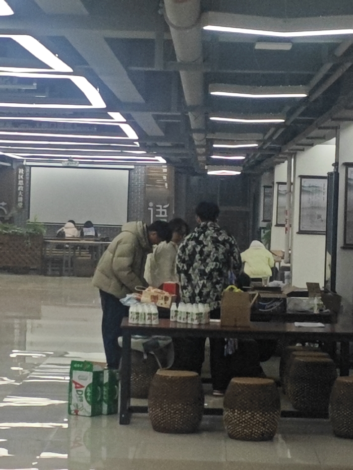 The image displays an indoor scene within a community center or lecture hall, identified by the visible Chinese characters "社区思贤大讲堂" (Community Sixian Lecture Hall) on the left wall. The location is in the city of Unknown, Unknown. The ceiling features exposed piping and multiple linear fluorescent light fixtures. The floor is light-colored and reflective. On the left wall, a large white projection screen is mounted above a wooden planter box containing green plants. On the right wall, several framed pictures are visible. In the midground, three individuals are gathered around a long, dark wooden table. A male in a beige puffer jacket and dark pants is leaning over the table, examining items. A female in a light-colored top stands next to him, also looking at the table. A second male, wearing a dark floral-patterned shirt, stands with his back mostly to the camera, similarly focused on the table. The table holds multiple plastic bottles with green labels, several brown cardboard trays, a red box, and a brown paper bag. Beneath the table, several woven cylindrical stools with wooden tops are positioned. On the floor to the left of the table, two green and white branded bags, identifiable as "AD Calcium Milk" packaging, are present. In the background, four additional individuals are seated at wooden tables. Two are on the left side, facing away from the camera, one wearing a light-colored puffer jacket and another a dark jacket. Further back on the right, one individual in a light yellow puffer jacket is seated facing away. A seventh person is partially obscured in the far background on the left. The individuals in the foreground appear to be organizing or distributing items, while those in the background are seated in the space.