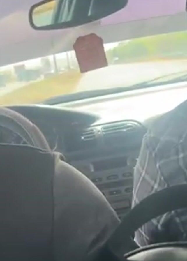 interior of a car, specifically the dashboard and the front seats. The view is from the back seats, looking through the windshield. There's a red air freshener hanging from the rearview mirror. The car is driving on a road with light traffic. Trees and buildings can be seen outside the car. Two people are visible in the front seats, one driving and one in the passenger seat wearing headphones and a plaid shirt. The lighting is bright and the day appears overcast.