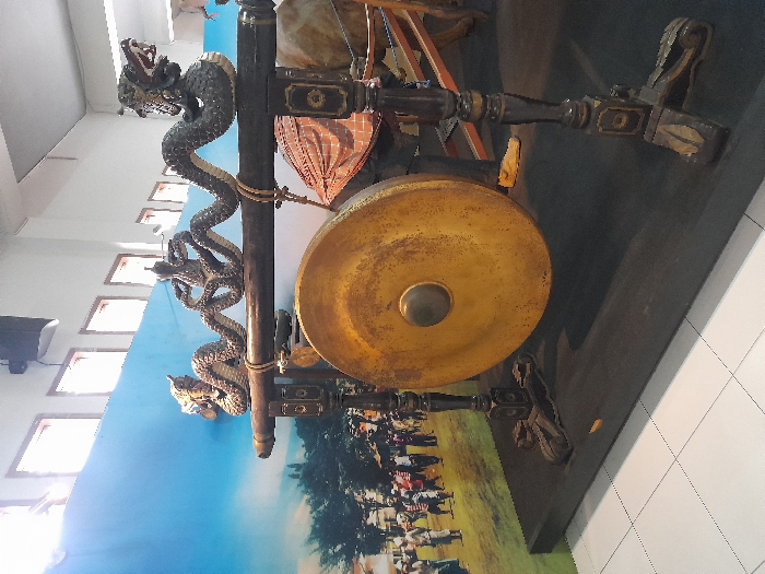 A large, round, golden gong hangs on a wooden frame decorated with a carved wooden dragon. The gong is suspended from a wooden beam that is supported by two elaborate carved wooden legs. The base of the gong is resting on a black platform. The platform is surrounded by white tiled flooring. In the background, there are windows with white walls, and a mural depicting a scene of people in a grassy field. The location is an indoor space, likely a museum or exhibit. The scene is empty and void of any human figures. The location is in the city of Kecamatan Buduran, Indonesia, which is located at the coordinates latitude: -7.434, longitude: 112.72.