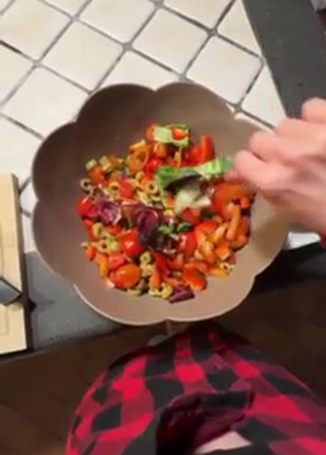 A person wearing a red and black plaid shirt is preparing a salad in a brown, flower-shaped bowl. The salad contains red peppers, cherry tomatoes, green olives, lettuce, and radicchio. The person uses a fork to mix the ingredients. The countertop has a beige and brown checkered tile pattern. A wooden cutting board and other kitchen items are visible nearby.