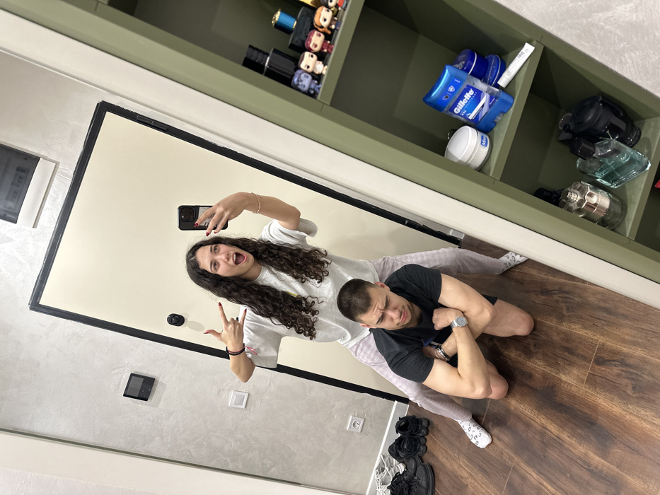 An indoor scene is captured in a full-length mirror, reflecting two individuals and surrounding objects. The primary subject is a young adult female, visible in the mirror, holding a black smartphone in her left hand to take the photograph. She has long, dark, curly hair, wears a light-colored t-shirt and light pants, with red nail polish on her fingers. Her mouth is open in an expression of excitement or surprise, and her right hand is raised in a "rock on" gesture. She stands with her legs positioned on either side of a young adult male, who is crouched on the floor in front of her. The male, visible in the mirror's reflection, wears a dark t-shirt and dark shorts/pants, with a silver wristwatch on his left wrist. He is crouching on a dark brown wooden floor, arms crossed over his knees, displaying a pouting or displeased facial expression. To the left of the male's position, a pair of dark sneakers or shoes rests on the wooden floor. The wall reflected in the mirror behind the subjects is light-colored and textured. Visible on this wall are a black rectangular panel (likely an intercom or control unit), a white light switch, and a white electrical outlet. To the right of the mirror, an olive-green open shelving unit is partially visible. The top shelf holds multiple bottles of cologne/perfume and four small, stylized collectible figures. The middle shelf displays a white jar, a blue Gillette deodorant stick, a blue jar, and a white tube. The bottom shelf contains three additional bottles of cologne/perfume. The specific location in the city of Sofia, Bulgaria, cannot be determined from the visual details presented in the image, which depicts a generic modern interior.