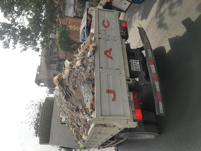 A light-colored JAC brand flatbed truck, bearing Syrian license plate "520 سوريا 8974" (identifying it as registered in the Damascus Governorate, which includes Barza Municipality), is shown parked or moving on an asphalt road. The truck's bed is severely overloaded with a prominent, uncontained mound of mixed refuse, consisting of construction debris, plastic bags, and general garbage. The tailgate features the letters "J A C" in red, and the rear bumper bar, marked with red and white reflective stripes, is noticeably bent downwards on the right side. In the background, under a bright, hazy sky, multiple multi-story residential buildings with flat roofs, some appearing aged, are visible. Green trees and other vegetation partially obscure these structures. A dark-colored sedan is partially visible parked behind the truck on the right. No individuals are depicted in the scene.