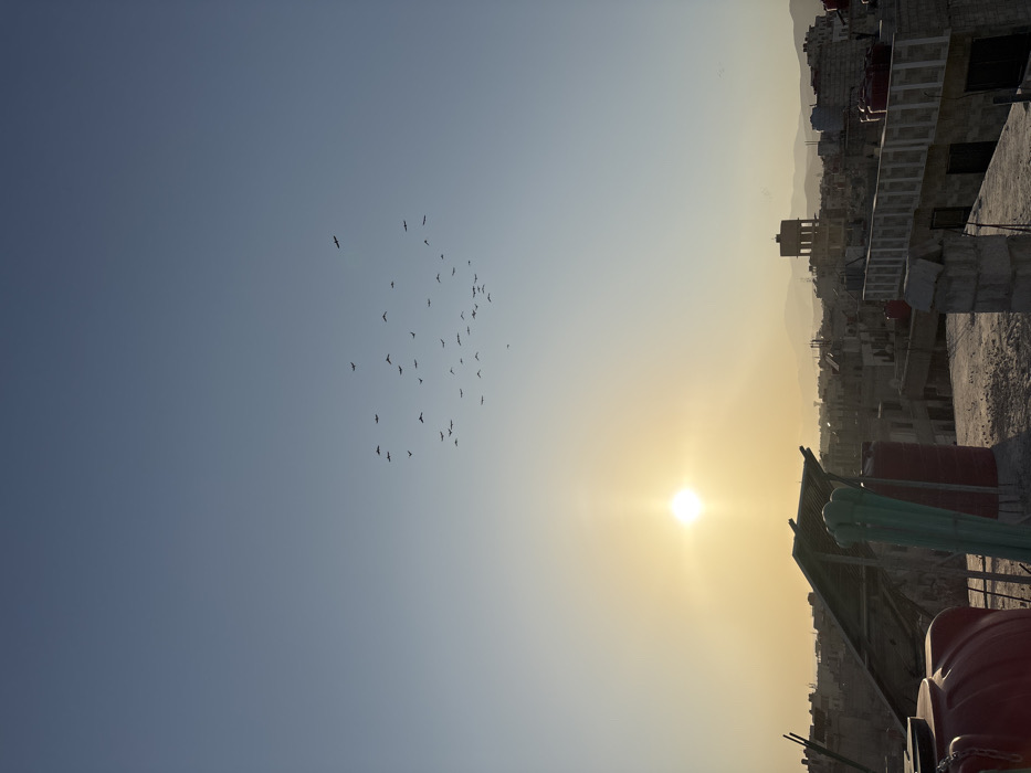 The image depicts an aerial view of the city of Mu'adammiyat ash-Sham, Syria, captured from a rooftop level during what appears to be late afternoon or early morning. The upper two-thirds of the frame are dominated by a clear, pale blue sky, transitioning to a golden-yellow hue near the horizon line on the left. A bright, unoccluded sun with visible rays emanates from the lower-left quadrant of the sky. Approximately 30-40 birds are visible in silhouette, flying in a loose, somewhat heart-shaped formation in the upper-middle section of the sky, above and to the right of the sun. Their wings are outstretched, indicating active flight. The lower third of the image shows a cluttered urban landscape. In the immediate foreground, on a flat concrete rooftop, several objects are visible. A large, reddish-brown cylindrical plastic water tank is prominently positioned in the lower-left corner. To its right, partially obscured, is a structure composed of corrugated metal sheeting, possibly a solar panel or a lean-to shelter, angled upwards towards the sun. Green pipes are visible extending from the ground near this structure. Another reddish-brown water tank is partially visible further into the midground on another rooftop. Various concrete structures, walls, and debris are scattered across the foreground rooftop. The midground reveals a dense residential area with numerous multi-story buildings, characterized by flat roofs and varying architectural styles, bathed in the soft, warm light of the low sun. A prominent square water tower structure on stilts is visible on a distant rooftop, silhouetted against the sky in the right-center midground. In the far background, hazy mountain ranges are visible along the horizon line, extending across the entire width of the frame, blending into the pale sky. The overall scene is well-lit, with long shadows implied by the low sun angle. No people are visible.