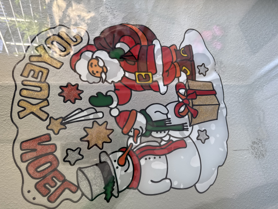 This image, captured in Le Puy-en-Velay, France, displays a multi-layered Christmas window decal adhered to a transparent surface