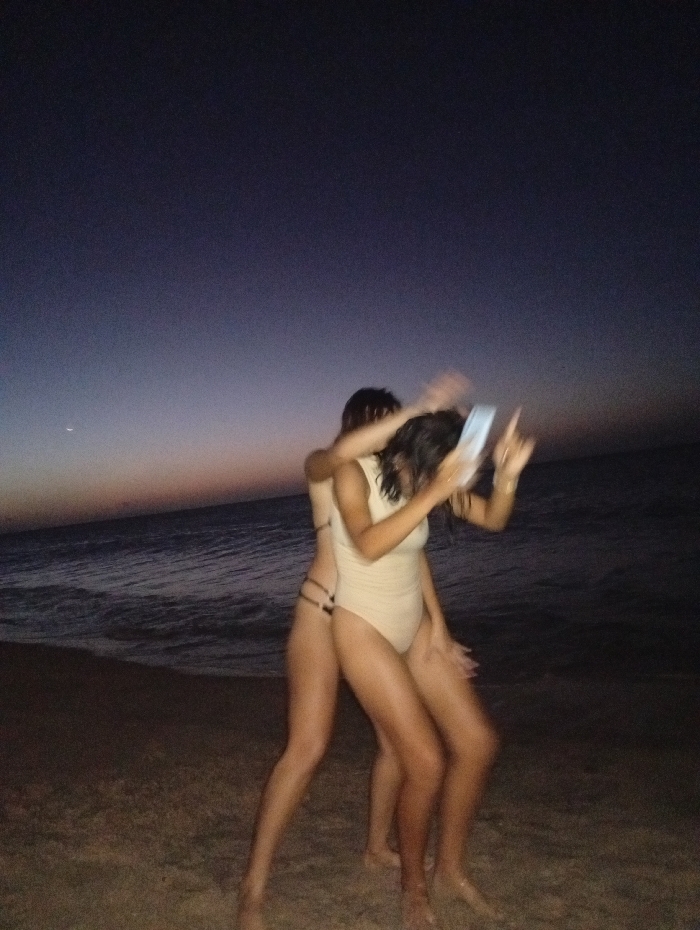 Two young women, clad in beach attire, stand on a sandy shoreline at dusk. The woman in front wears a light-colored one-piece swimsuit, while the other sports a bikini. One is holding a mobile device and has her arm raised, as if taking a selfie or video. Gentle waves wash onto the beach behind them, and the sky fades from orange to a dark blue at the horizon. The image has a slightly blurred aesthetic, conveying movement.