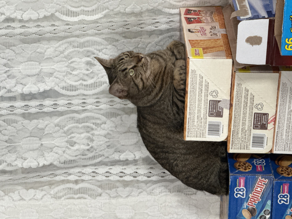 A grey tabby cat is nestled among a stack of boxes. The cat's head is turned upward with its eyes visible, while its body stretches diagonally across the image. The boxes, various sizes and colors, include cookie and snack boxes. Packaging details such as "20," "28 Principe," "Tia Risa," and "66" are visible, along with nutritional information and contact details in Spanish. The scene is set against a white lace background.