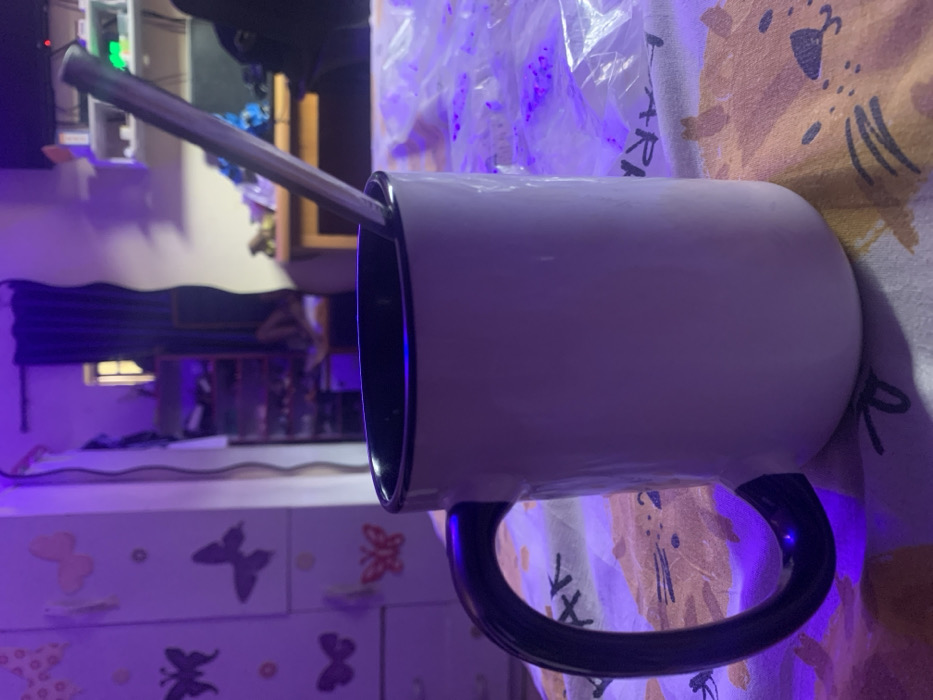 A white mug with a black interior and handle sits on a colorful surface with a cartoon cat print. A silver straw protrudes from the mug. The mug is positioned in front of a white dresser adorned with butterfly decorations. A television and other furniture are faintly visible in the background, illuminated by a purple light. The overall scene is casual and domestic.