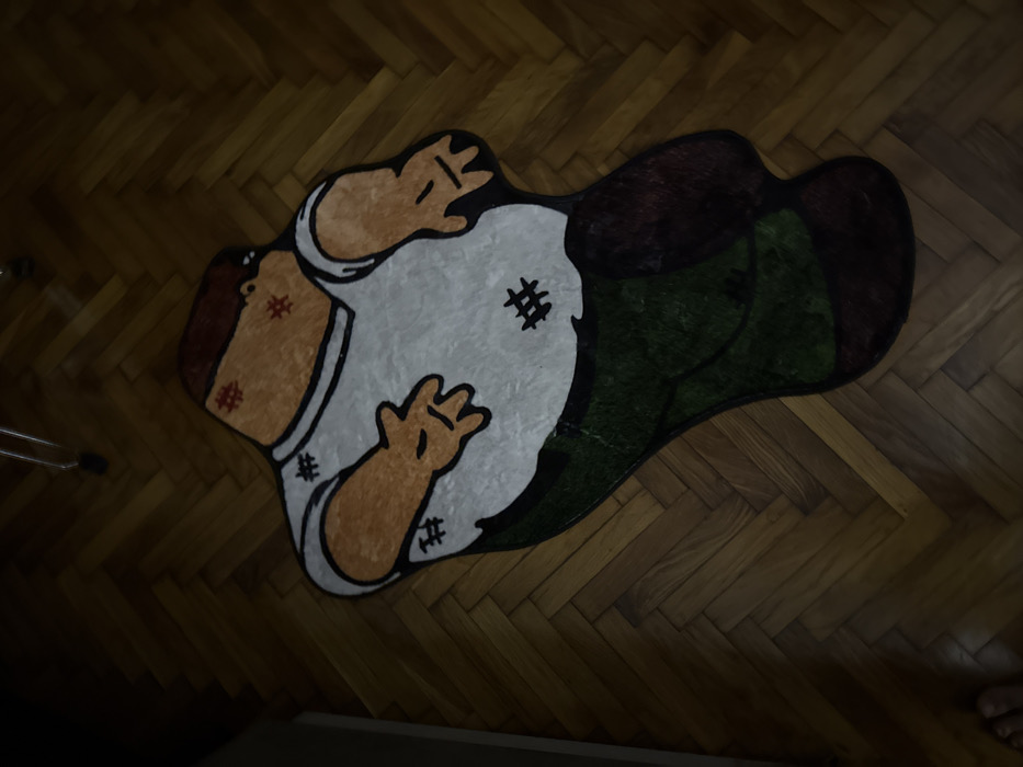 - "A custom-shaped rug depicting the cartoon character Peter Griffin is centrally displayed on a wooden herringbone parquet floor within a dimly lit indoor environment in Trudovets, Bulgaria" by FM-52Rpt2, licensed under CC BY 4.0