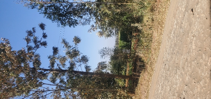 A rural road stretches through a landscape of trees and vegetation. Lush green foliage contrasts with the clear blue sky peeking through the branches above. The road appears worn, with a rough, gravelly texture. Sunlight dapples the scene, creating a mix of light and shadow along the roadside. The overall impression is one of a peaceful, natural environment.