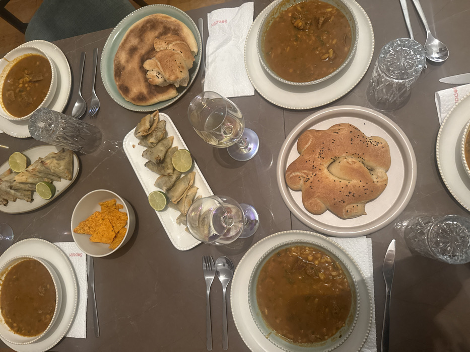This image displays an overhead view of a dining table prepared for a meal in a domestic setting within Rueil-Malmaison, France. The dark, reflective table surface is covered with numerous dishes. Four white bowls, each placed on a larger light-colored plate with a beaded rim, contain a stew-like dish featuring meat and legumes. Two rectangular white platters, also with beaded rims, hold triangular savory pastries, each garnished with slices of lime. A smaller white bowl contains a quantity of orange tortilla chips. Two round plates present different breads: one holds a large, round, flatbread that appears partially torn, and the other displays a distinct flower-shaped bread sprinkled with black seeds. Three stemmed wine glasses are visible, two containing a light-colored liquid, and one empty. Three textured clear tumblers are also present, two of which appear empty. Multiple sets of silver-colored cutlery, including forks, spoons, and knives, are arranged around the place settings. White paper napkins, one marked "Senchiry," are positioned beneath some plates. No individuals are visible in the frame; the scene depicts an arranged meal awaiting or during consumption.