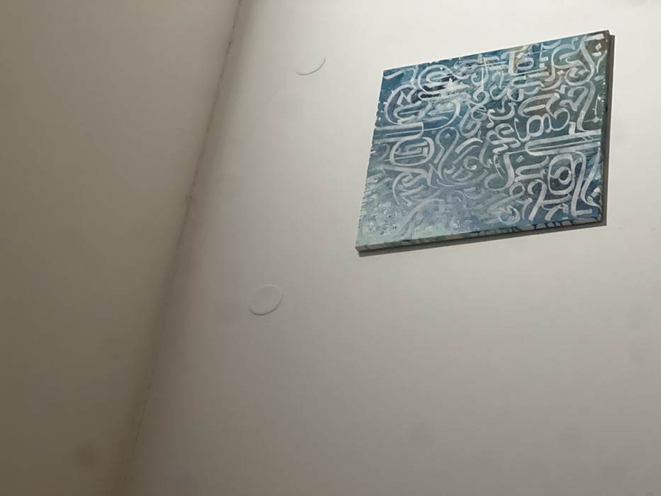 The scene depicts an interior, likely a room, within the city of Unknown, Unknown. A large section of a light-colored, possibly off-white, wall occupies the majority of the frame, with a matching ceiling visible in the upper right. A dark, thin line, consistent with dirt or mold accumulation, traces the seam where the wall and ceiling meet. Three circular indentations are visible on the wall surface: one centrally located in the upper half of the wall, another further to its right, and a fainter, smaller one below and to the left of the central indentation. A rectangular canvas painting hangs on the lower right portion of the wall. The painting is oriented vertically and features dense, white or light-colored calligraphic script or abstract forms over a background dominated by shades of blue and teal, with minor brown or gold accents. The painting casts a subtle shadow, indicating it is slightly raised from the wall surface. No individuals are present in the image.
