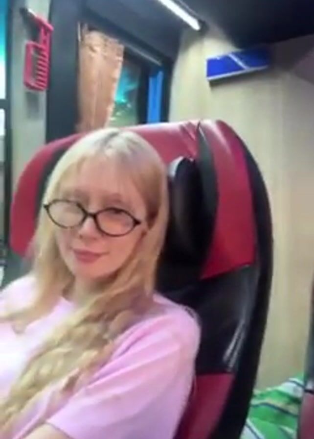 Two young women are seated on a bus. One woman, with blonde hair and glasses, wears a pink shirt and sits upright looking at the camera. The other woman, with light brown hair, is slumped in her seat, her hand resting on her cheek. The bus interior is visible, with red and black seats and a window covered by a brown curtain.