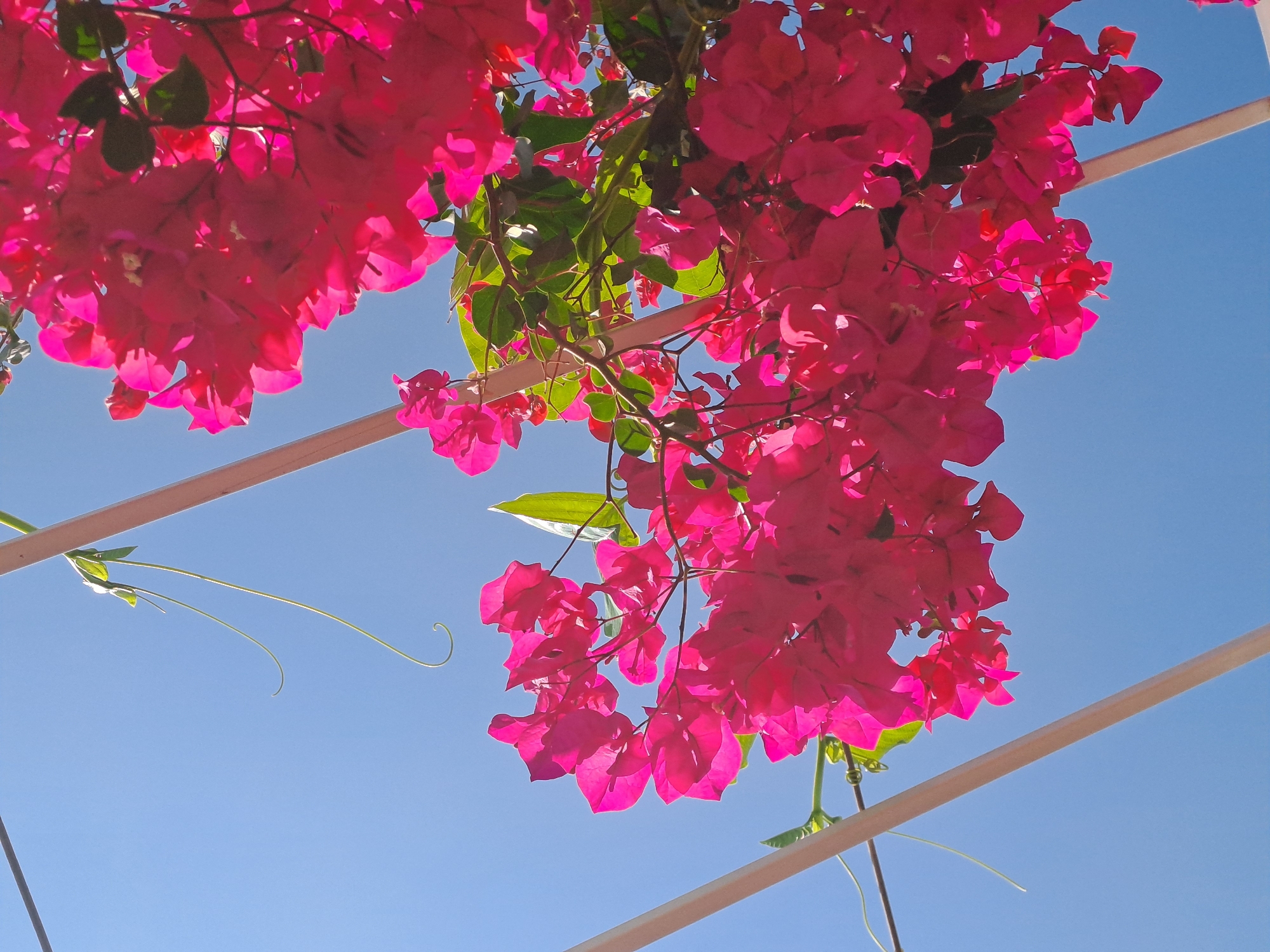 A low-angle outdoor photograph depicts dense clusters of vibrant magenta bougainvillea flowers against a clear, bright blue sky. Interspersed green foliage is visible among the flowers. Several light-colored structural beams, consistent with a pergola or trellis, are present; two prominent beams extend diagonally across the upper portion of the frame. Thin, curled plant tendrils are also visible against the sky. The scene is brightly illuminated by natural sunlight, casting a glow through the translucent flower bracts. This floral arrangement is located in the city of Nha Trang, Vietnam.