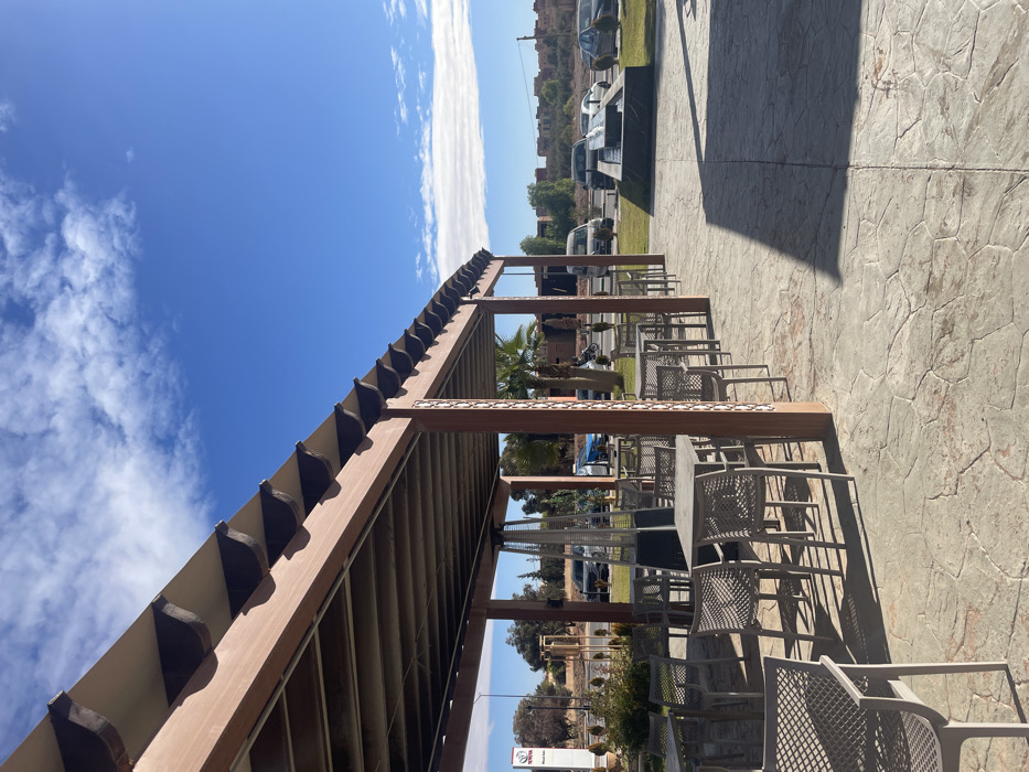 This image depicts an outdoor patio of a commercial establishment in Lkheng, Morocco, under bright daylight