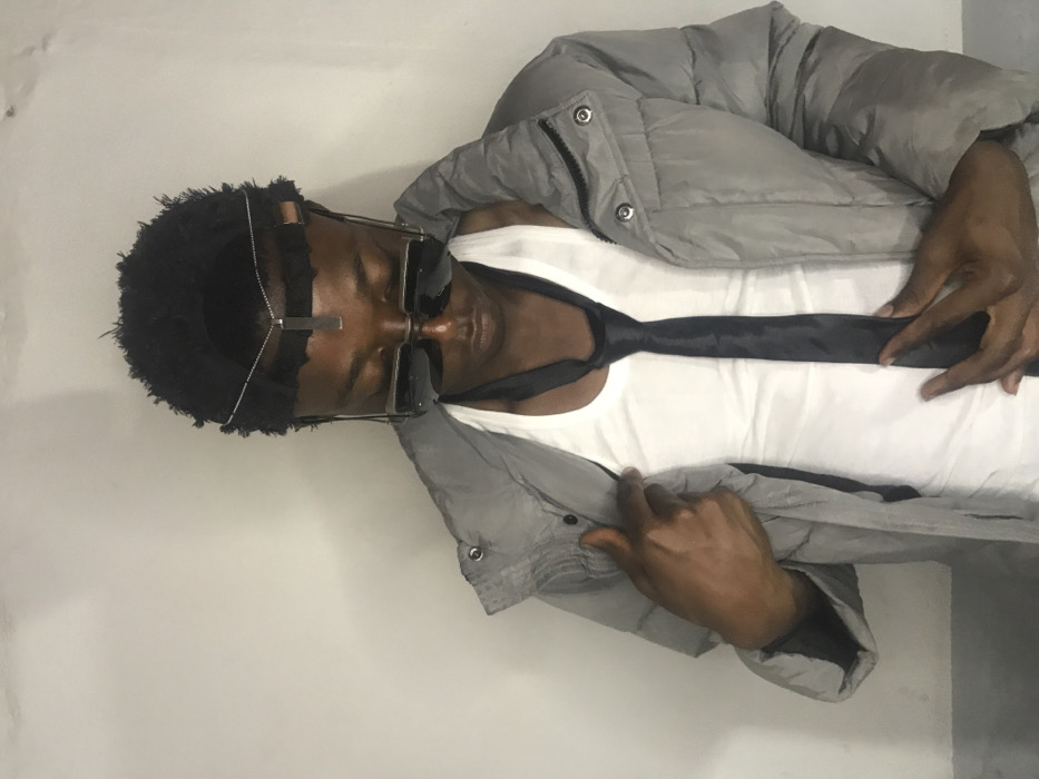 An individual with dark skin is depicted from the waist up, standing against a plain, light grey wall in what is identified as Kirana, Nigeria. The subject wears a black, short, textured hairstyle or head covering with frayed edges, accented by a silver-colored chain worn across the forehead, featuring a vertical bar pendant centrally placed. Dark, rectangular sunglasses rest low on the nose, obscuring the eyes, which are directed downwards. The individual is dressed in a white sleeveless undershirt, over which a loose, untied black necktie hangs. A light grey puffer jacket with visible press-studs is worn unzipped. The subject's right hand grasps the left lapel of the jacket, while the left hand touches the black necktie.
