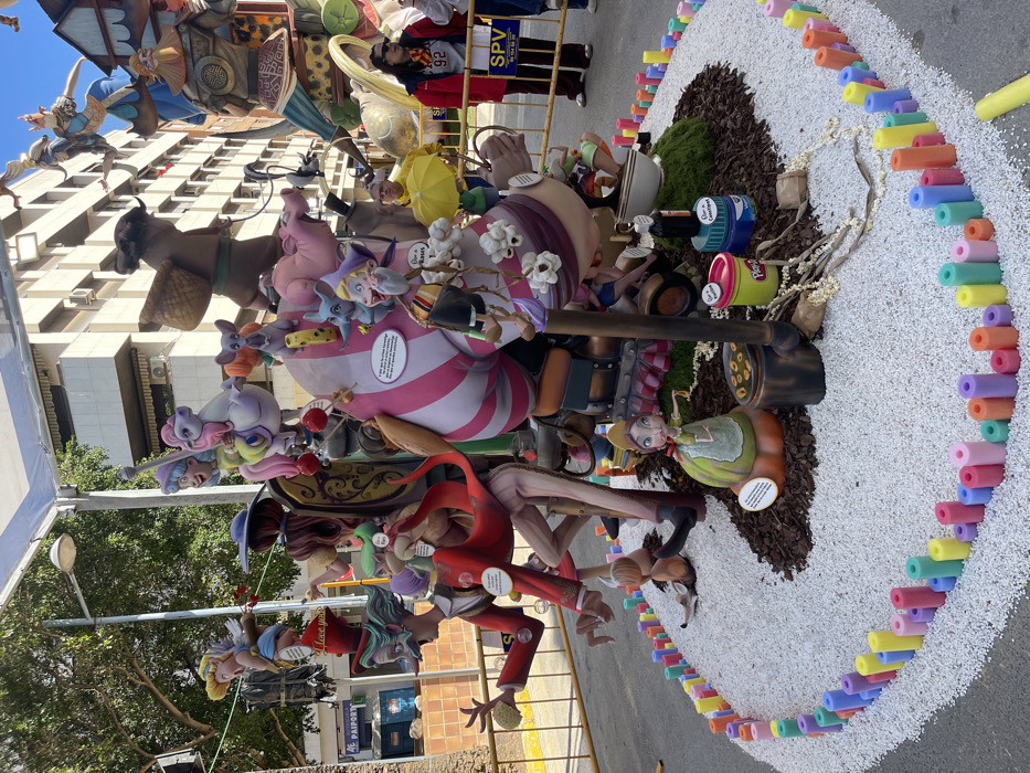 The image depicts an outdoor public art installation, identified as a Fallas monument, located on a paved street or plaza in Paiporta, Spain